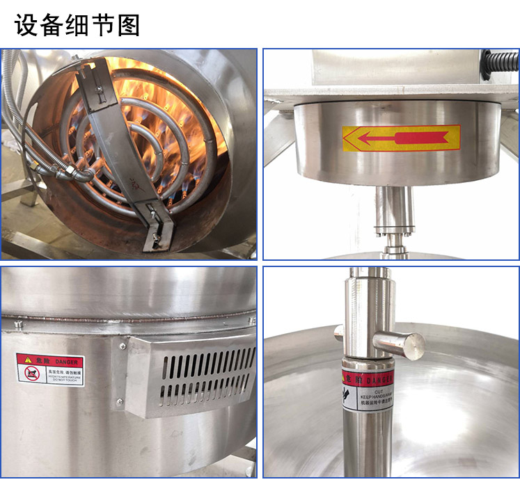 大型全自動食堂餐廳炒菜鍋鍋體為一次性沖壓成型的半球體不銹鋼鍋體,使鍋內平整光滑。攪拌方式采用特殊的傾斜式傳動,使用的行星式攪拌器與鍋體充分接觸,實現傳動公轉與自轉的不整數傳動比,使物料攪拌全方位死角。使用先進的傳動與密封結構,使傳動部分與鍋內潔凈、衛生。采用無級變頻調速器,能將高粘度產物混合均勻加熱提高熱量,具有易于操作,工作效率高,耗能低,運行平穩,使用壽命長,結構緊湊,維修方便等特點,另本機采用液壓升降,翻鍋運料,免拆裝攪拌器,節省人力,降低勞動強度,是性能優良的食品加工設備。