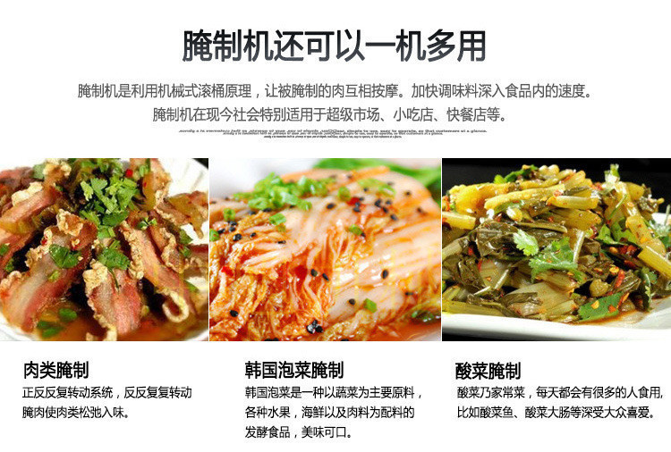 滾揉機可以使肉均勻的吸收腌漬,可以提高肉的結著力及產品的彈性;可以提高產品的口感及斷面效果;可以增強保水性,增加出品率;可以改善產品的內部結構,節能高效。整機采用不銹鋼制造,結構緊湊,滾筒兩端均采用旋壓式封帽結構,最大的增加滾筒內的摔打空間,使滾揉產品的效果均勻,噪音小,性能可靠,操作簡便,使用效率更高。